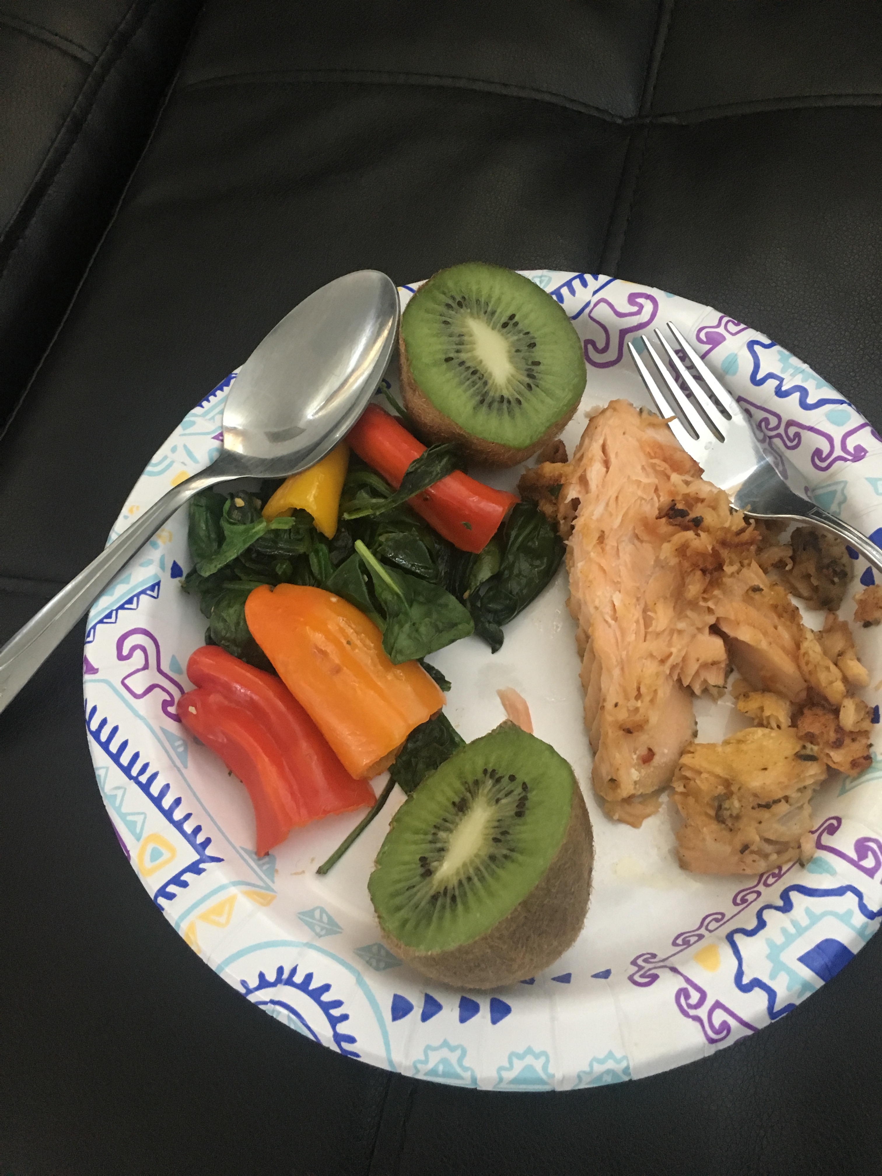 Baked Salmon With Spinach and Sweet peppers with a side of kiwi.